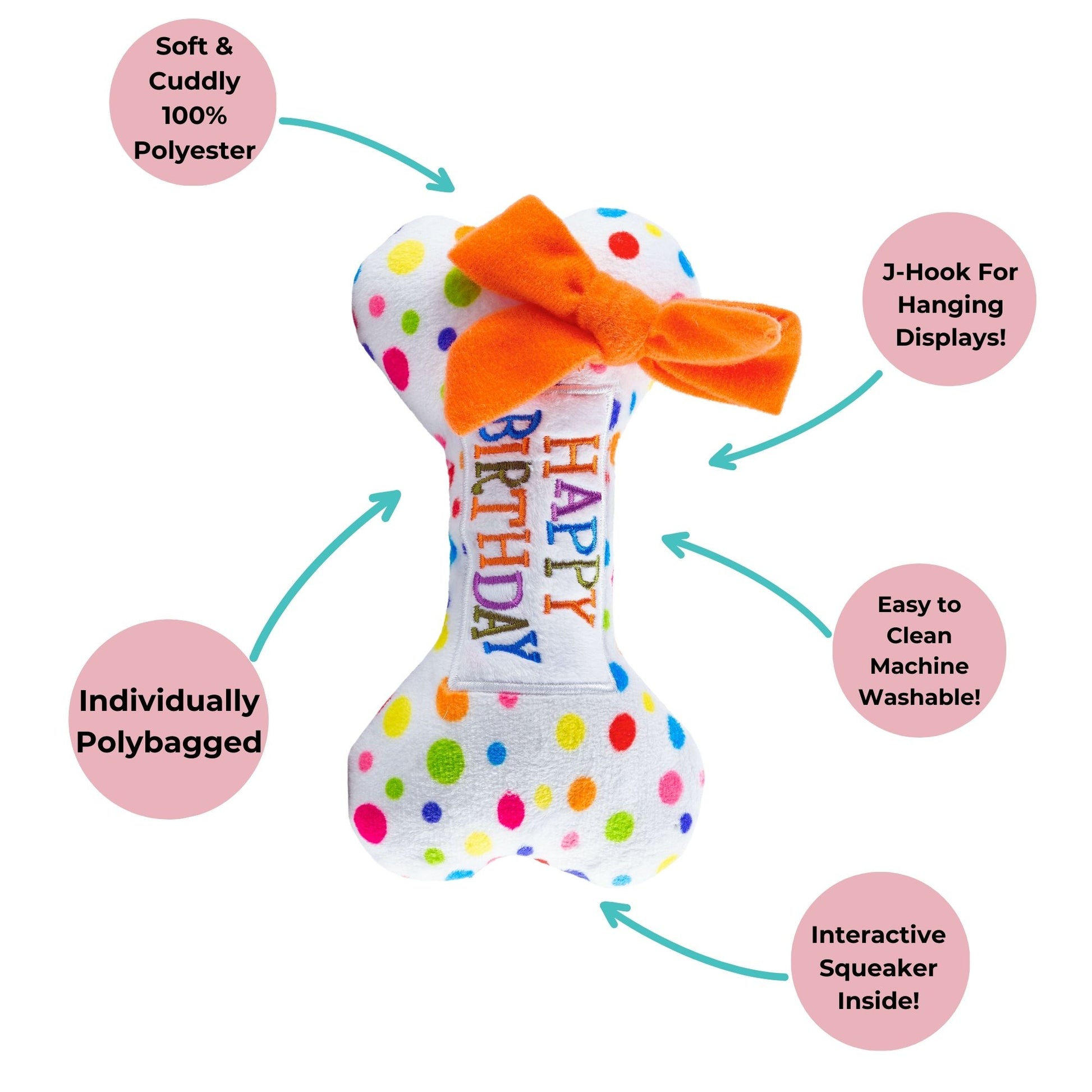 with the “Pawty All The Time" Birthday Bone plush toy! The exciting squeaker inside will make every day a tail-wagging good time.