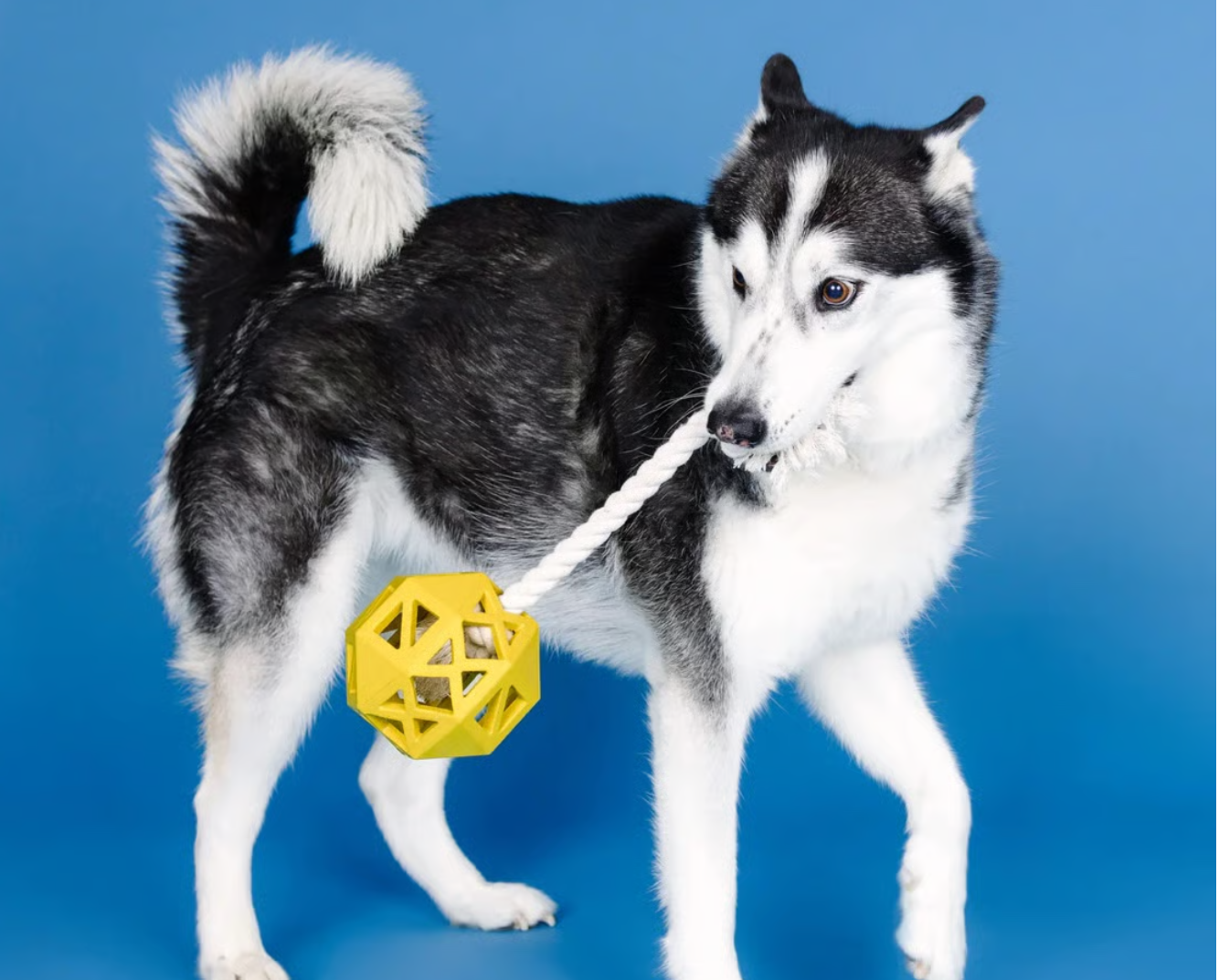 Ready to join the Dura Club? PetShop by Fringe Studio's "Pull My Way" yellow rubber dog toy is for pups that love to work for their treats, chew, and play lots of fetch. Made with natural rubber, a treat dispenser, tuggable rope, and an erratic bounce, this toy was created for long-lasting interactive play. Simply toss it for some fetchin' fun or fill it with treats to keep your pup busy trying to get them out. Great for all-sized dogs and strong chewers.